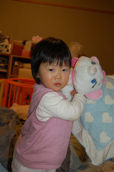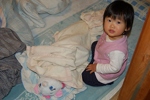 最近、Marieちゃん人形がとてもお気に入りで世話をするのが好きらしいです。枕をセットして、布団に寝かせてタオルを掛けてあげている図。