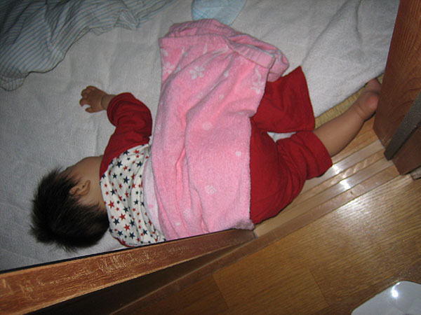 嫁が娘を寝かしつけた後しばらくすると隣の部屋を隔てるふすまから「ドンッ」と衝撃音が・・・。嫁と「もしかして・・・」とふすまを開けると、娘が寝てます。痛くないのかなー?ぐぅぐぅ寝てますけど(笑最近、うつぶせ寝(横向き寝?)が好きらしく、ひっくり返してもしばらくすると元通り。