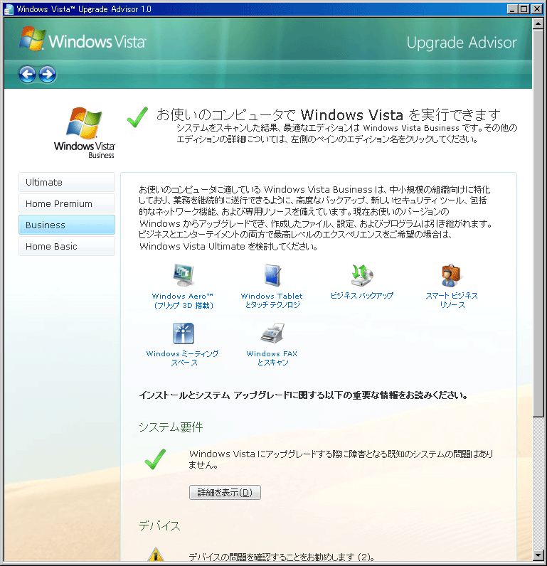 使っているPCがVistaへアップグレード出来るかチェックするソフトです。早速、先日組み上げたメインPCに掛けたところ「Businessがおすすめですよー」だそうで。